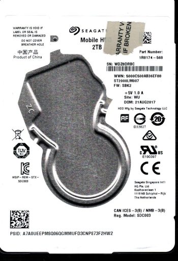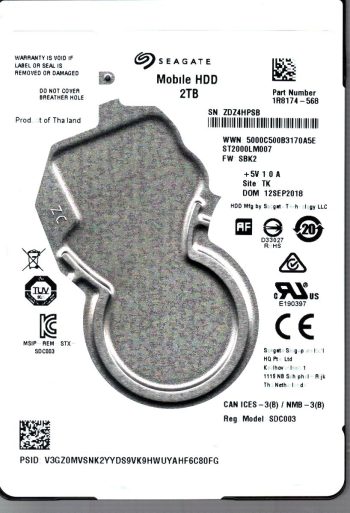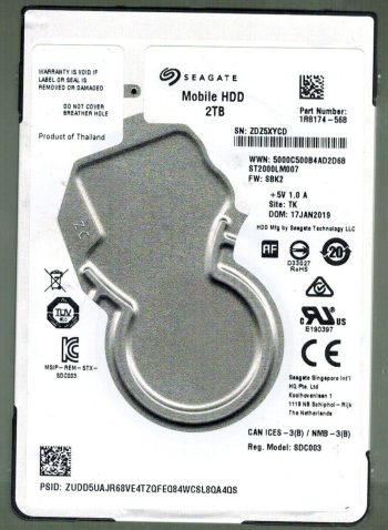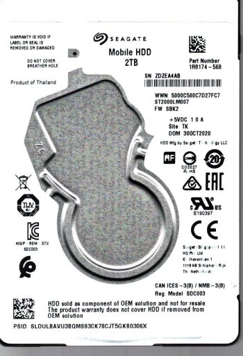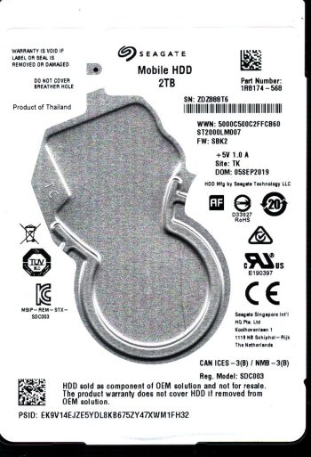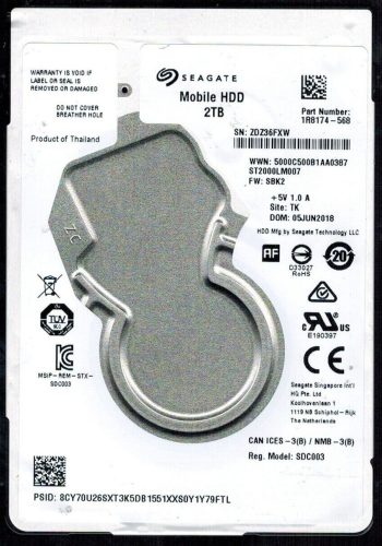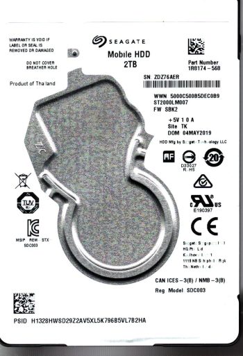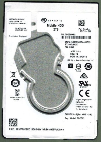 Model:ST2000LM007 Capacity:2TB Serial number:ZDZ888T6 Date of manufacture:SEP 2019 Country of manufacture:THAILAND. PCB:100815565 REV A Firmware:SBK2 Part number:1R8174-568 pa_code:TK SKU:11846