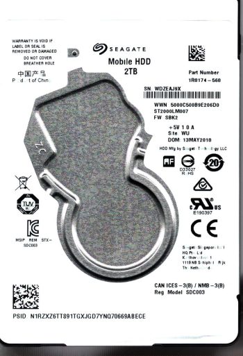 Model:ST2000LM007 Capacity:2TB Serial number:WDZFT8QC Date of manufacture:AUG 2018 Country of manufacture:CHINA PCB:100809471 REV A Firmware:SBK2 Part number:1R8174-568 Sitecode:WU SKU:11949