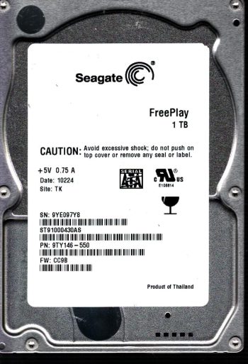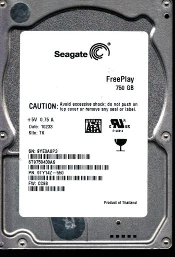 Model:ST9750430AS Country of manufacture:THAILAND Capacity:750GB Serial number:9YE0A0P3 Date of manufacture:JAN 10233 PCB:100570750 REV A QR code:0748 F Part number:9TY14Z-550 SKU:11535