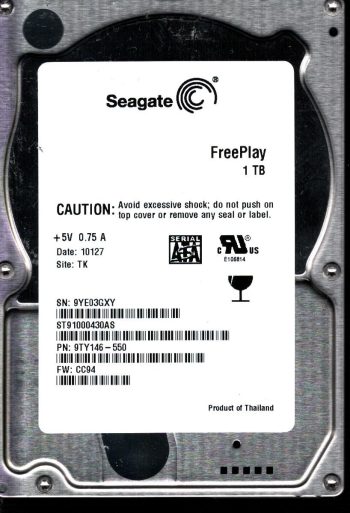 Model:ST91000430AS Country of manufacture:THAILAND Capacity:1TB Serial number:9YE097Y8 Date of manufacture:JAN 10224 PCB:100570750 REV A QR code:0748 F Part number:9TY146-550 SKU:10974