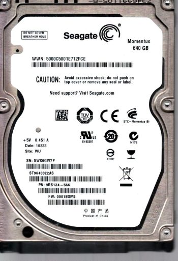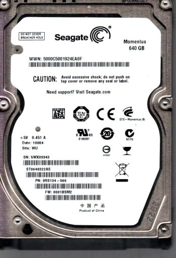 Model:ST9640322AS Country of manufacture:CHINA Capacity:640GB Serial number:5WX0GW7P Date of manufacture:JAN 10233 PCB:100564667 REV A QR code:4665 C Part number:9RS134-566 SKU:11177
