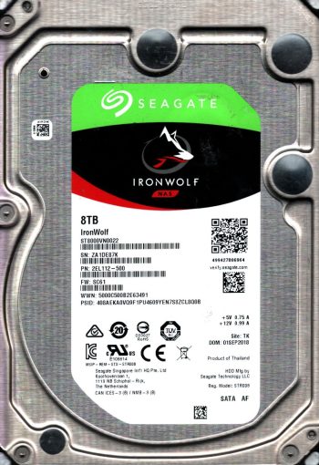 Model:ST8000VN0022 Country of manufacture:THAILAND Capacity:8TB Serial number:ZA1DE87K Date of manufacture:SEP 2018 PCB:100768434 REV A QR code:8433 N Part number:2EL112-500 SKU:11659