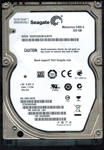 Model:ST9320325AS Country of manufacture:CHINA Capacity:320GB Serial number:6VD7JVCN PCB:100536286 REV E QR code:100536284 Part number:9HH13E-567 SKU:10275