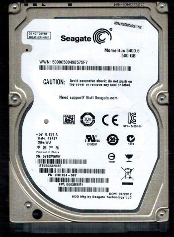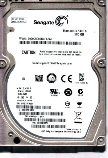 Model:ST9500325AS Country of manufacture:CHINA Capacity:500GB Serial number:5VESW8VK Date of manufacture:APR 2012 PCB:100660535 REV B QR code:100586927 Part number:9HH134-567 SKU:10515