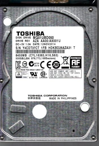 Model:MQ01UBD050 Country of manufacture:PHILIPPINES Capacity:500GB Serial number:Y4CDT37CT 1FB Date of manufacture:NOV 2014 PCB:G003250A Part number:HDKBD26AZA31 T SKU:11110