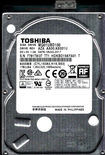 Model:MQ01UBD100 Country of manufacture:PHILIPPINES Capacity:1TB Serial number:7781T913T TT1 Date of manufacture:JUL 2017 PCB:G003250A Part number:HDKBD19AYA01 T SKU:11410
