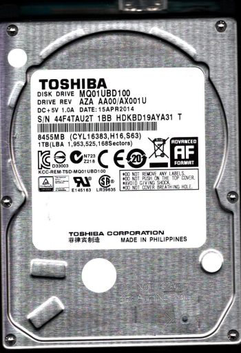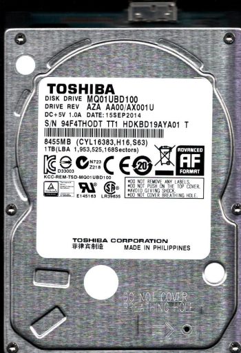Model:MQ01UBD100 Country of manufacture:PHILIPPINES Capacity:1TB Serial number:94F4TH0DT TT1 Date of manufacture:SEP 2014 PCB:G003250A Part number:HDKBD19AYA01 T SKU:11411