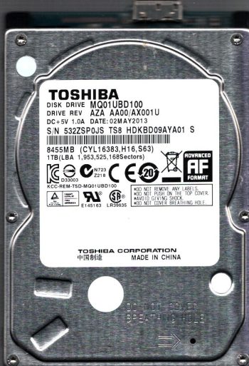 Model:MQ01UBD100 Country of manufacture:CHINA Capacity:1TB Serial number:532ZSP0JS TS8 Date of manufacture:MAY 2013 PCB:G003296A Part number:HDKBD09AYA01 S SKU:11508
