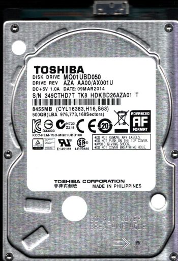 Model:MQ01UBD050 Country of manufacture:PHILIPPINES Capacity:500GB Serial number:349CTHD7T TK8 Date of manufacture:MAR 2014 PCB:G003250A Part number:HDKBD26AZA01 T SKU:11568