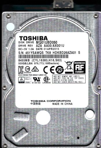 Model:MQ01UBD050 Country of manufacture:CHINA Capacity:500GB Serial number:451YSAWQS TK8 Date of manufacture:APR 2015 PCB:G003250A Part number:HDKBD26AZA01 T SKU:11570