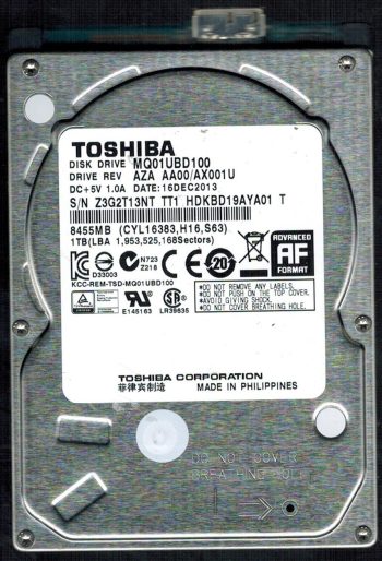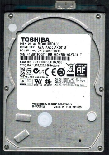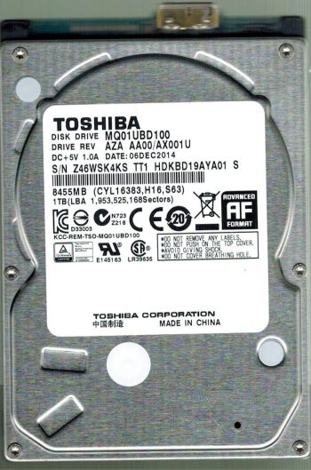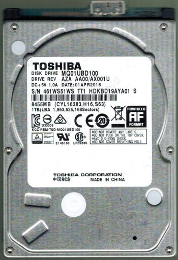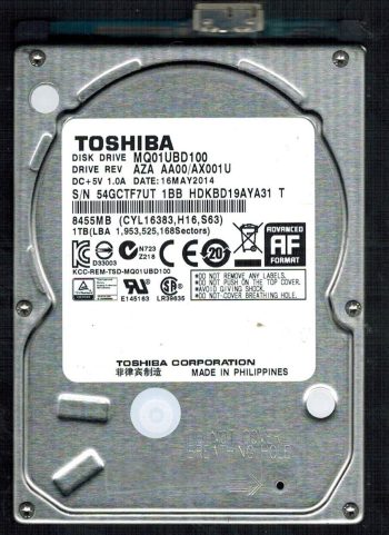Model:MQ01UBD100 Country of manufacture:CHINA Capacity:1TB Serial number:461WS51WS TT1 Date of manufacture:APR 2016 PCB:G003250A Part number:HDKBD19AYA01 S SKU:10230