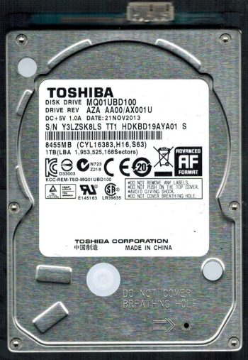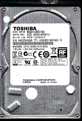 Model:MQ01UBD100 Country of manufacture:CHINA Capacity:1TB Serial number:Y3LZSK8LS TT1 Date of manufacture:NOV 2013 PCB:G00325 A Part number:HDKBD19AYA01 S SKU:10560