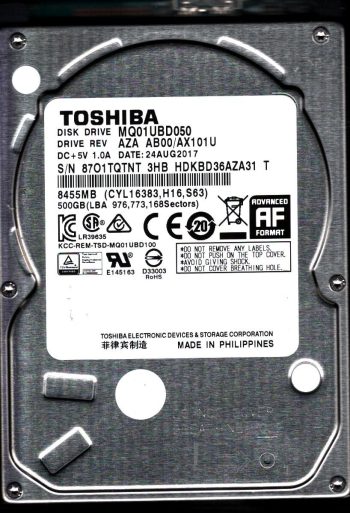 Model:MQ01UBD050 Country of manufacture:PHILIPPINES Capacity:500GB Serial number:8701TQTNT 3HB Date of manufacture:AUG 2017 PCB:G344BA Part number:HDKBD36AZA31 T SKU:10699
