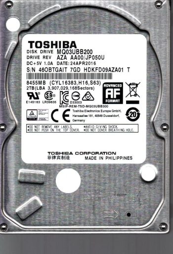 Model:MQ03UBB200 Country of manufacture:PHILIPPINES Capacity:2TB Serial number:460BTGAIT 7GD Date of manufacture:APR 2016 PCB:G3959A Part number:HDKFD09AZA01 T SKU:11107