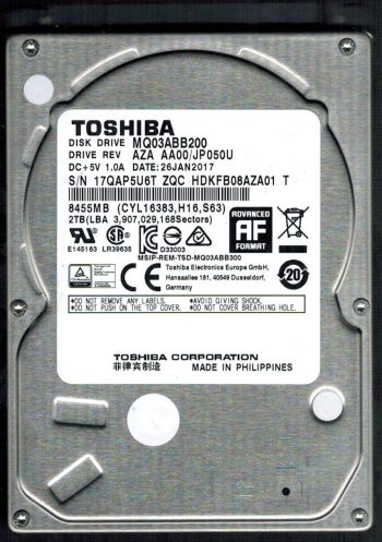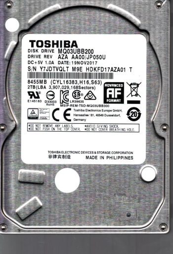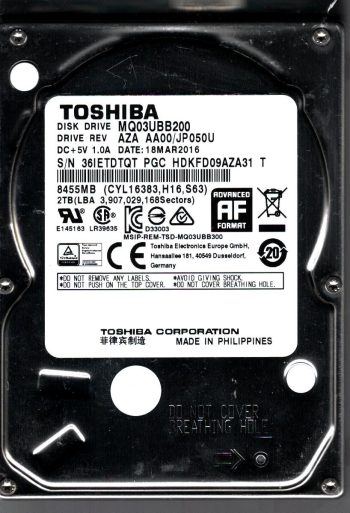 Model:MQ03ABB200 Country of manufacture:PHILIPPINES Capacity:2TB Serial number:17QAP5U6TZQC Date of manufacture:JAN 2017 PCB:G391BA Part number:HDKFB08AZA01 T SKU:10200