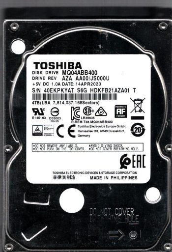 Model:MQ04ABB400 Country of manufacture:PHILIPPINES Capacity:4TB Serial number:40EKPKYAT S6G Date of manufacture:APR 2020 PCB:G4311A Part number:HDKFB21AZA01 T SKU:11510