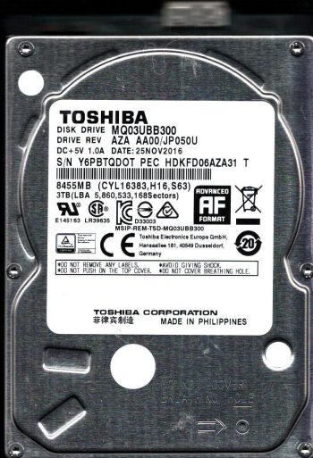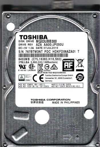 Model:MQ03UBB300 Country of manufacture:PHILIPPINES Capacity:3TB Serial number:767BTW3NT PDCÂ Date of manufacture:JUL 2016 PCB:G3959A Part number:HDKFD06AZA01 T SKU:11511