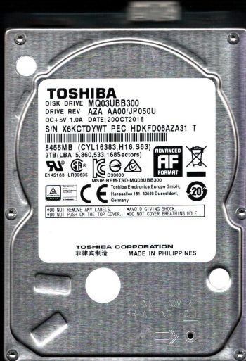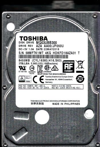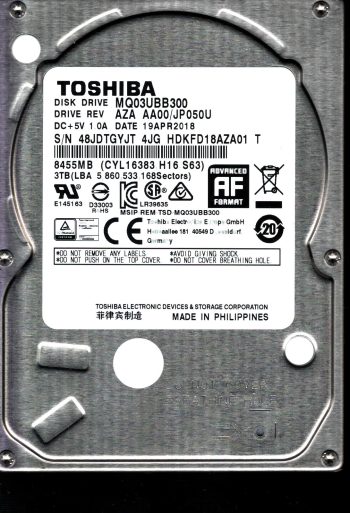 Model:MQ03UBB300 Capacity:3TB Serial number:48JDTGYJT Date of manufacture:APR 2018 Country of manufacture:PHILIPPINES PCB:G3959A Part number:HDKFD18AZA01 T Rev:AZA AA00/JP050U SKU:11996