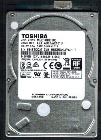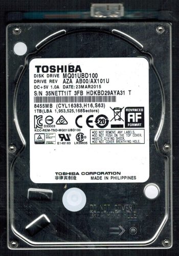 Model:MQ01UBD100 Country of manufacture:PHILIPPINES Capacity:1TB Serial number:35NETT1IT 3FB Date of manufacture:MAR 2015 PCB:G344BA Part number:HDKBD29AYA31 T SKU:10527