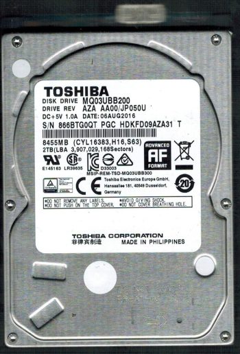 Model:MQ03UBB200 Country of manufacture:PHILIPPINES Capacity:2TB Serial number:866BTG0QT PGC Date of manufacture:AUG 2016 PCB:G3959A Part number:HDKFD09AZA31 TÂ SKU:10517