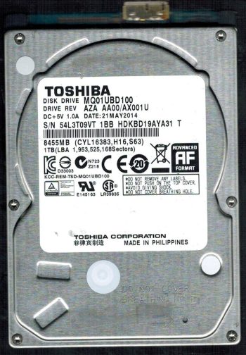 Model:MQ01UBD100 Country of manufacture:PHILIPPINES Capacity:1TB Serial number:54L3T09VT 1BB Date of manufacture:MAY 2014 PCB:G003250A Part number:HDKBD19AYA31 T SKU:10616