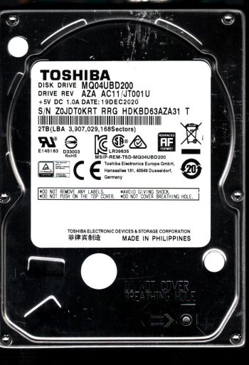 Model:MQ04UBD200 Country of manufacture:PHILIPPINES Capacity:2TB Serial number:Z0JDT0KRT RRG Date of manufacture:DEC 2020 PCB:G0039A Part number:HDKBD63AZA31 T SKU:10830
