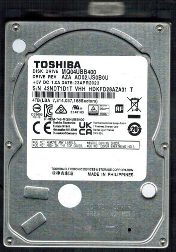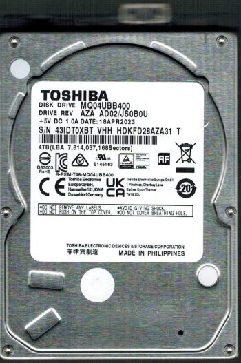 Model:MQ04UBB400 Country of manufacture:PHILIPPINES Capacity:4TB Serial number:431DT0XBT Date of manufacture:APR 2023 PCB:G0089A Part number:HDKFD28AZA31 T SKU:10119