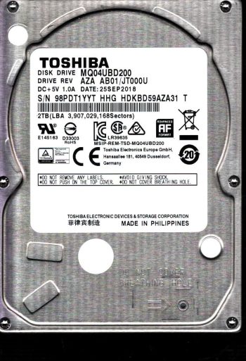 Model:MQ04UBD200 Country of manufacture:PHILIPPINES Capacity:2TB Serial number:98PDT1YYT HHGÂ Date of manufacture:SEP 2018 PCB:G0034A Part number:HDKBD59AZA31 T SKU:10997