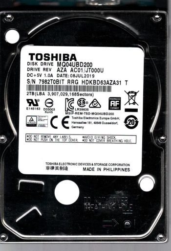 Model:MQ04UBD200 Country of manufacture:PHILIPPINES Capacity:2TB Serial number:7982T0BIT RRG Date of manufacture:JUL 2019 PCB:G0039A Part number:HDKBD63AZA31 T SKU:11179