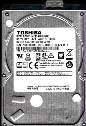 Model:MQ04UBD200 Country of manufacture:PHILIPPINES Capacity:2TB Serial number:798DT09HT RRG Date of manufacture:JUL 2019 PCB:G0039A Part number:HDKBD63AZA31 T SKU:11272