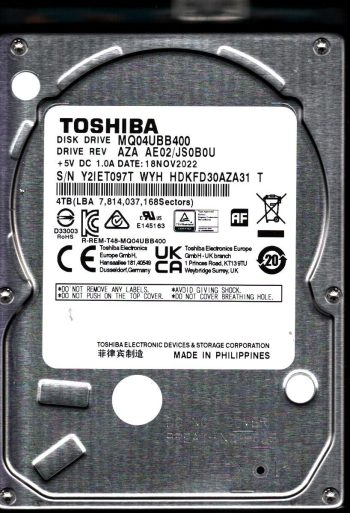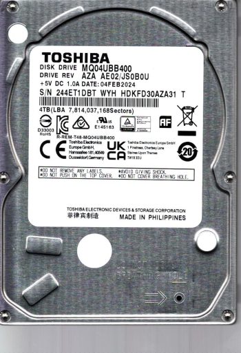 Model:MQ04UBB400 Country of manufacture:PHILIPPINES Capacity:4TB Serial number:244ET1DBT WYH Date of manufacture:FEB 2024 PCB:G0090A Part number:HDKFD30AZA31 T SKU:11355