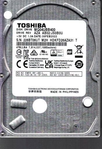 Model:MQ04UBB400 Country of manufacture:PHILIPPINES Capacity:4TB Serial number:226BT06UT M2H Date of manufacture:FEB 2022 PCB:G0034A Part number:HDKFD26AZA31 T SKU:11501