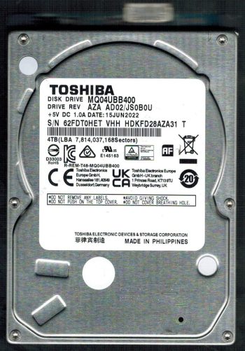 Model:MQ04UBB400 Country of manufacture:PHILIPPINES Capacity:4TB Serial number:62FDT0HETVHH Date of manufacture:JUN 2022 PCB:G0089A Part number:HDKFD28AZA31 T SKU:10381