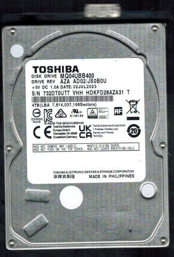 Model:MQ04UBB400 Country of manufacture:PHILIPPINES Capacity:4TB Serial number:732DT0UTT VHH Date of manufacture:JUL 2023 PCB:G0089A Part number:HDKFD28AZA31 T SKU:10556