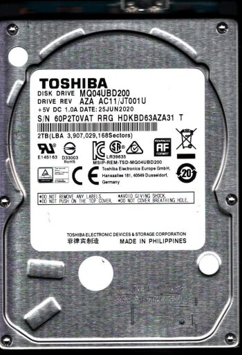Model:MQ04UBD200 Country of manufacture:PHILIPPINES Capacity:2TB Serial number:60P2T0VAT RRG Date of manufacture:JUN 2020 PCB:G0039A Part number:HDKBD63AZA31 T SKU:10697
