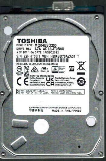 Model:MQ04UBD200 Country of manufacture:PHILIPPINES Capacity:2TB Serial number:Z2HHT05IT Date of manufacture:DEC 2022 PCB:G0089A Part number:HDKBD75AZA31 T SKU:10118