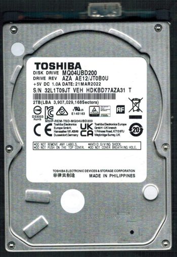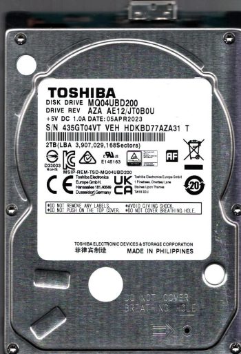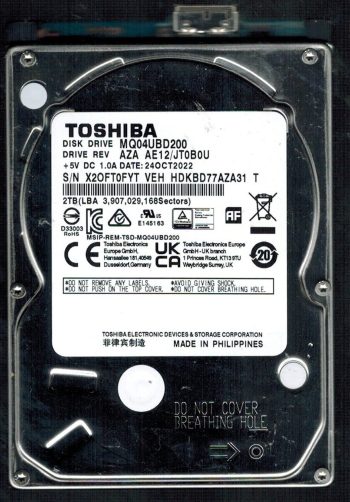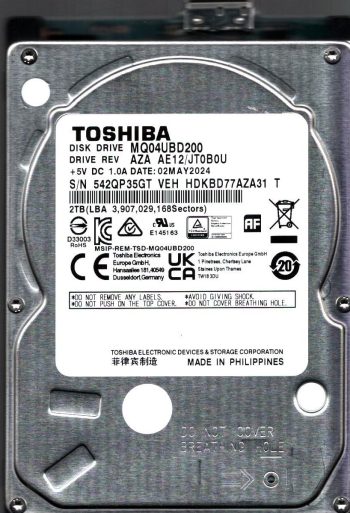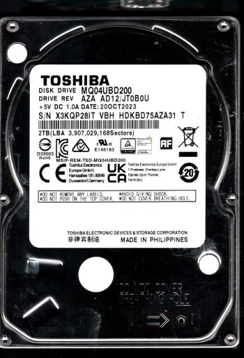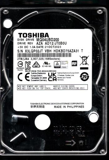 Model:MQ04UBD200 Capacity:2TB Serial number:834ET0EKT VEH Date of manufacture:AUG 2023 Country of manufacture:PHILIPPINES PCB:G0090A Part number:HDKBD77AZA31 T SKU:11714
