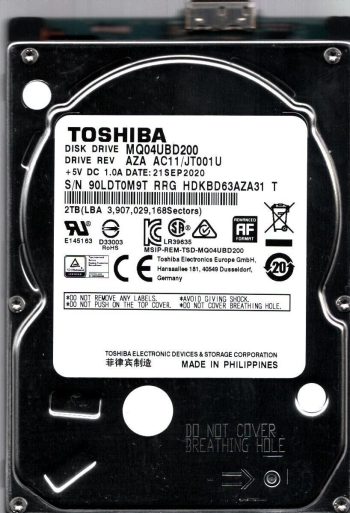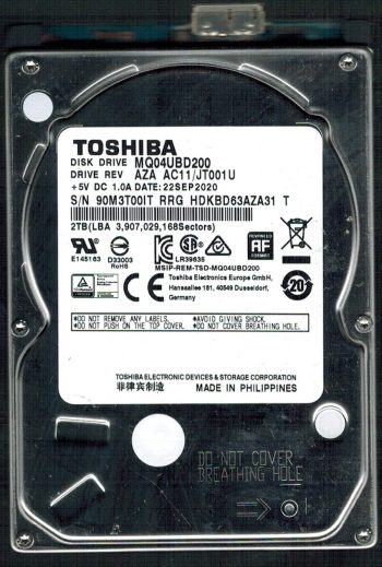 Model:MQ04UBD200 Country of manufacture:PHILIPPINES Capacity:2TB Serial number:90LDT0M9T RRG Date of manufacture:SEP 2020 PCB:G0039A Part number:HDKBD63AZA31 T SKU:11356