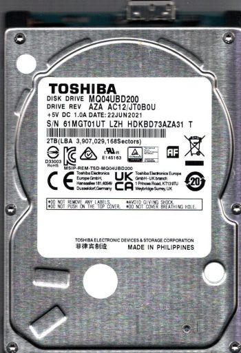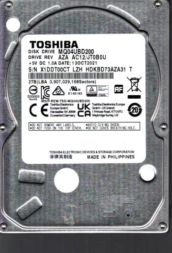 Model:MQ04UBD200 Country of manufacture:PHILIPPINES Capacity:2TB Serial number:X1DDT00CT LZH Date of manufacture:OCT 2021 PCB:G0039A Part number:HDKBD73AZA31 T SKU:11518