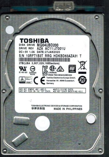 Model:MQ04UBD200 Country of manufacture:PHILIPPINES Capacity:2TB Serial number:10RFT1B3T RRG Date of manufacture:JAN 2020 QR code:G0039A Part number:HDKBD63AZA31 T SKU:10203