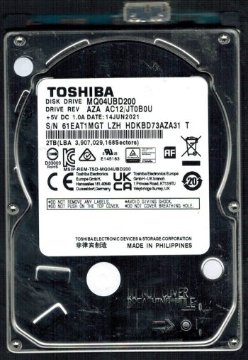 Model:MQ04UBD200 Country of manufacture:PHILIPPINES Capacity:2TB Serial number:61EAT1MGTLZH Date of manufacture:JUN 2021 PCB:G0039A Part number:HDKBD73AZA31 T SKU:10391