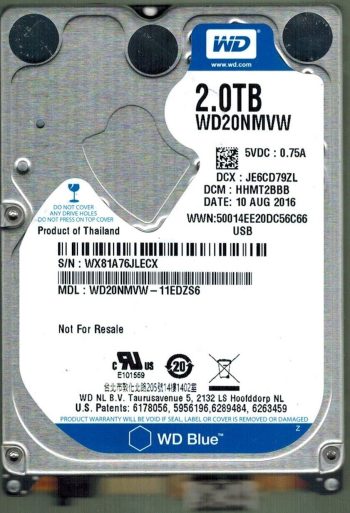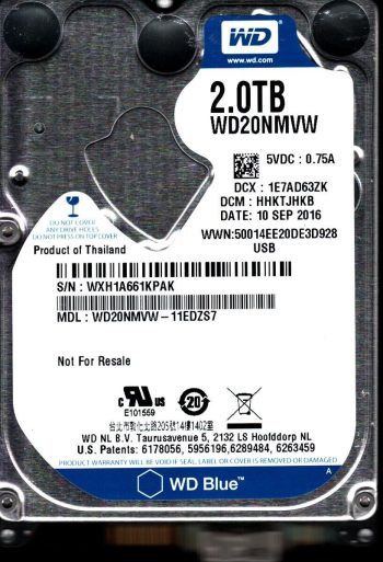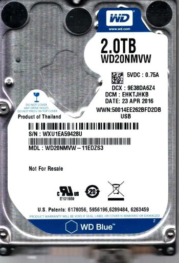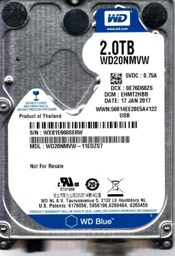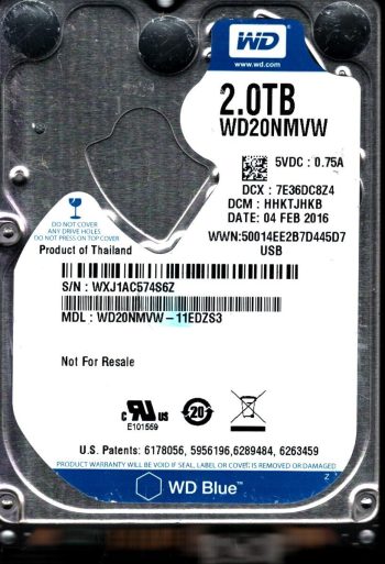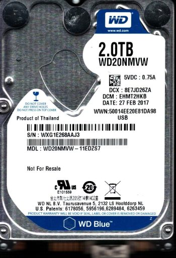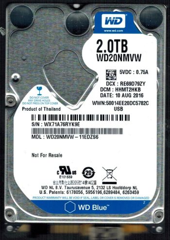 Model:WD20NMVW-11EDZS6 Country of manufacture:THAILAND Capacity:2TB Serial number:WX71A76RYK9E DCM:HHMT2HKB Date of manufacture:AUG 2016 PCB:2060-771961-001 REV B QR code:771961-S01 SKU:10246