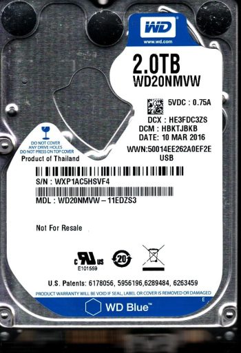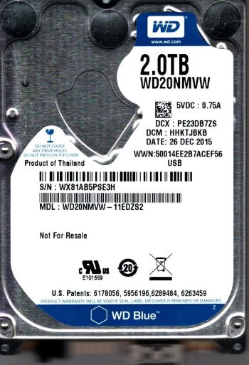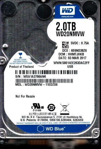 Model:WD20NMVW-11AV3S3 Country of manufacture:THAILAND Capacity:2TB Serial number:WX71A34N2651 DCM:HBMTJHKB Date of manufacture:MAY 2014 PCB:2060-771961-001 REV A QR code:771961-101 SKU:11290