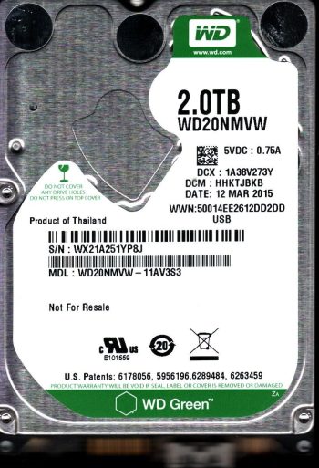 Model:WD20NMVW-11AV3S3 Country of manufacture:THAILAND Capacity:2TB Serial number:WX21A251YP8J DCM:HHKTJBKB Date of manufacture:MAR 2015 PCB:2060-771961-001 REV A QR code:771961-101 SKU:10806