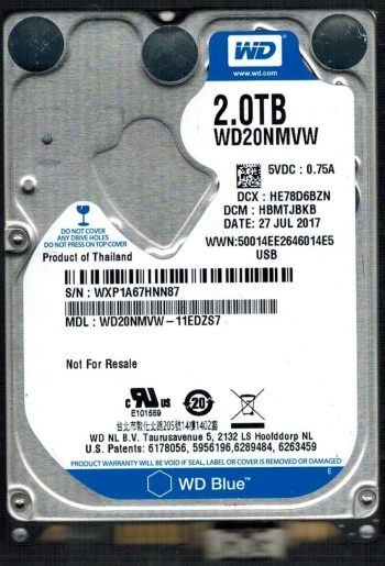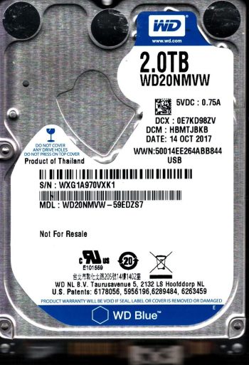 Model:WD20NMVW-59EDZS7 Country of manufacture:THAILAND Capacity:2TB Serial number:WX91A47AS3HP DCM:HBMT2BKB Date of manufacture:APR 2017 PCB:2060-771961-001 REV B QR code:771961-R01 SKU:10642