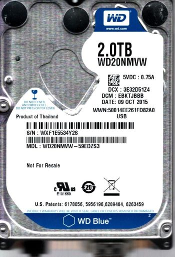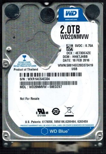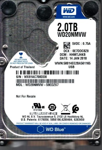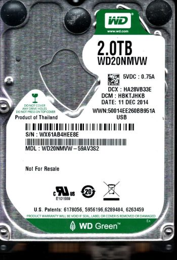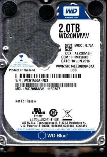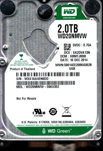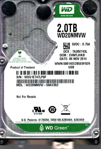Model:WD20NMVW-59AV3S2 Country of manufacture:THAILAND Capacity:2TB Serial number:WXG1E747LP6F DCM:EHMTJHKB Date of manufacture:NOV 2014 PCB:2060-771961-001 REV A QR code:771961-G01 SKU:11251