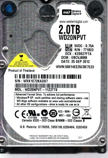 Model:WD20NPVT-11Z2TT0 Capacity:2TB Serial number:WXK1E72KADS7 DCM:EBCVJBBB Date of manufacture:SEP 2012 Country of manufacture:THAILAND PCB:2060-771823-000 REV A QR code:771823-200 SKU:11784