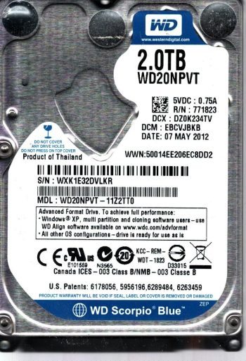 Model:WD20NPVT-11Z2TT0 Capacity:2TB Serial number:WXK1E32DVLKR DCM:EBCVJBKB Date of manufacture:MAY 2012 Country of manufacture:THAILAND PCB:2060-771823-000 REV A QR code:2060-771823-000 REV A SKU:11785