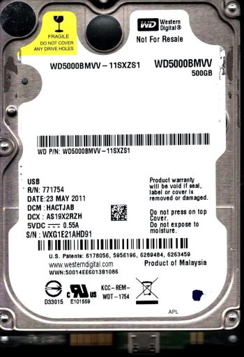 Model:WD5000BMVV-11SXZS1 Country of manufacture:MALAYSIA Capacity:500GB Serial number:WXG1E21AHD91 DCM:HACTJAB Date of manufacture:MAY 2011 PCB:2060-771754-000 REV A QR code:701754-500 SKU:10870