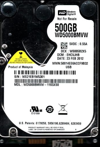 Model:WD5000BMVW-11S5XS0 Country of manufacture:MALAYSIA Capacity:500GB Serial number:WX21EB1W5301 DCM:EHCVJHB Date of manufacture:FEB 2012 PCB:2060-771801-002 REVA QR code:771801-002 SKU:11041